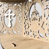 Дерев’яна полочка з витічними орнаментами та храмовими мотивами. Дизайн включає купол, хрести та складні геометричні форми, що створюють неймовірно красивий декоративний елемент для вашого будинку