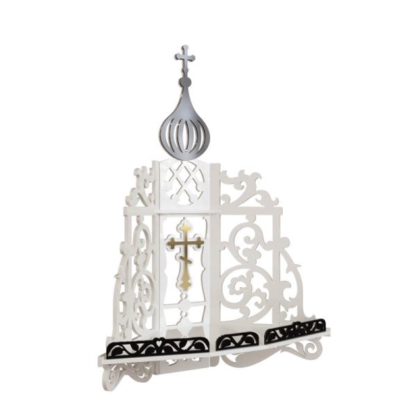 Ця оригінальна кутова поличка стане чудовим доповненням до вашого домашнього іконостасу. Вона виготовлена з якісного дерева і має форму купола, що надає їй особливої урочистості. Бічні стінки полички прикрашені вишуканим ажурним декором, а на верхівці розташований хрест. Кутова форма полички дозволяє оптимально використовувати простір кімнати. Поличка ідеально підходить для створення затишного місця для молитви та духовних практик.