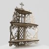 Кутова триярусна дерев’яна поличка з ажурними бічними стінками, різьбленим декором та хрестом.