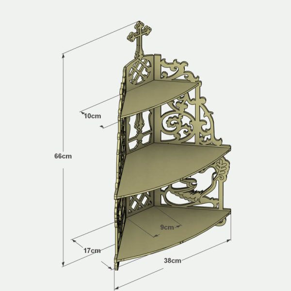 Ця витончена кутова триярусна поличка стане чудовим доповненням до вашого домашнього іконостасу. Вона виготовлена з якісного дерева і має три яруси для розміщення ікон. Бічні стінки полички прикрашені вишуканим ажурним декором, що надає їй особливої легкості та витонченості. Особливістю цієї полички є наявність хреста, що символізує віру. Кутова форма полички дозволяє оптимально використовувати простір кімнати. Поличка ідеально підходить для створення затишного місця для молитви та духовних практик.