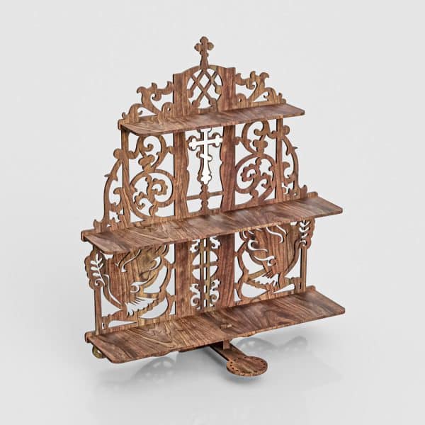 Дерев’яна поличка з трьома практичними полицями, виготовлена з натурального дерева. Декорована вітражними орнаментами і хрестами, підходить як для домашнього декору, так і для церковних приміщень. Кожен елемент ручно оброблений, що додає їй оригінальності та естетики.