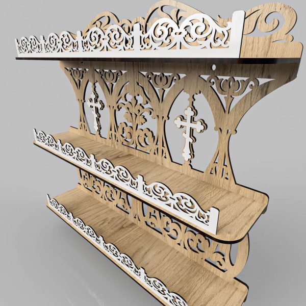 Наша дерев’яна полочка — це гармонійне поєднання функціональності та краси. Виготовлена з якісного дерева, вона має три практичні полиці для організації простору, а також витічні орнаменти, що додають їй унікальності. Дизайн включає символічні елементи: хрести та складні геометричні форми, що підкреслюють духовну атмосферу. Ця полочка стане яскравим акцентом у будь-якому внутрішньому просторі, від спальні до гостинної.