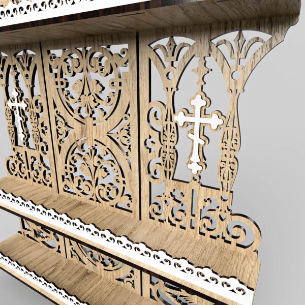 Наша дерев’яна полочка — це гармонійне поєднання функціональності та краси. Виготовлена з якісного дерева, вона має три практичні полиці для організації простору, а також витічні орнаменти, що додають їй унікальності. Дизайн включає символічні елементи: хрести та складні геометричні форми, що підкреслюють духовну атмосферу. Ця полочка стане яскравим акцентом у будь-якому внутрішньому просторі, від спальні до гостинної.