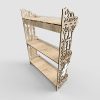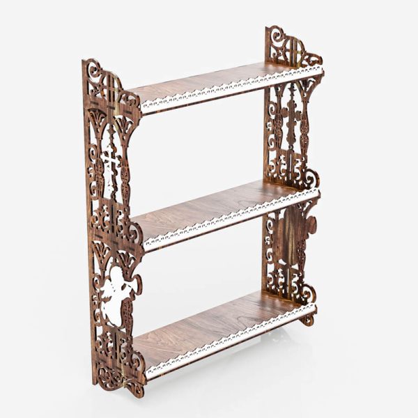 Трехъярусная деревянная полочка с резными боковыми стенками, украшенными христианскими символами.